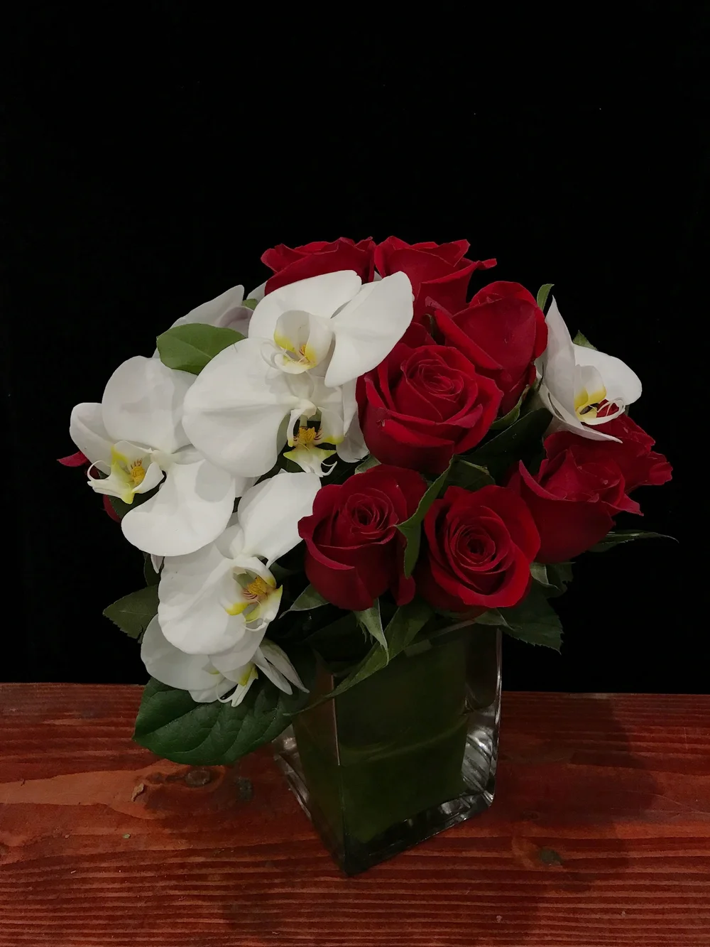 D16 A Dozen Red Roses With White Phalaenopsis Orchids Urban Flowers